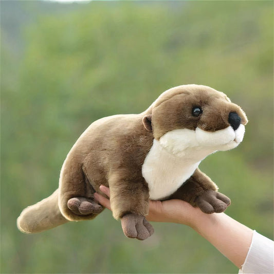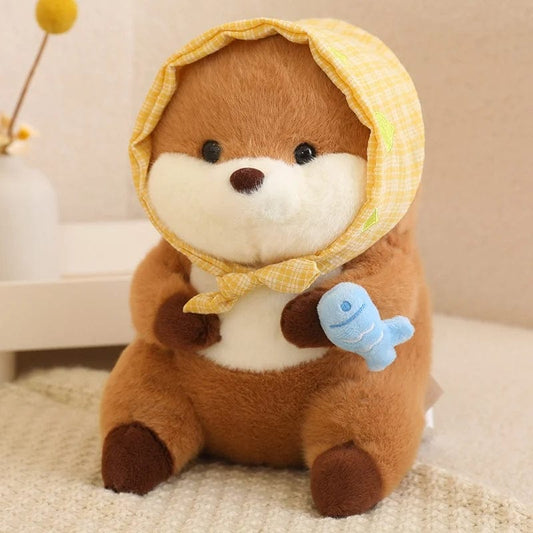 Peluche loutre avec un chapeau qui tient un poisson coloré